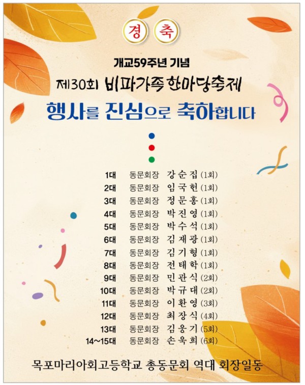 1대 동문회장 강순집 (1회) 2대 동문회장 임국헌 (1회) 3대 동문회장 정문홍 (1회) 4대 동문회장 박진영 (1회) 5대…